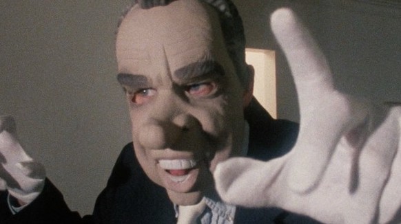 HORROR HOUSE ON HIGHWAY FIVE (1985) A hodgepodge of slasher movie clichés, bizarre comedy, and incoherent storytelling, this bargain-basement oddity feels like the bastard child of John Waters and Herschell Gordon Lewis—on acid. College students assigned to do a study on a Nazi serial killer(!) get stranded in the middle of nowhere and are terrorized by a couple of demented brothers whose father just happens to be the Nazi in question. And that’s about as logical as I can make this movie sound. Thrown into the confusing brew are actors flubbing their lines, slap-happy, cartoonish fist fights, a man who falls face-first onto the spikes of a garden rake, and for those who like their pot of crazy fully stirred, a killer in a Richard Nixon mask. The debut feature film of music video director Richard Casey. Stick with your day job, Richard. D
