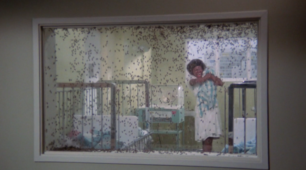 THE SWARM (1978) Probably the most polished of the short-but-prolific killer bee sub-school of movies of the late ’70s. In the aftermath of a devastating attack by a mutated strain of killer bees on a Texas Air Force base, the military is called in to assess the situation and is informed by a scientist (Michael Caine) that the swarm will most likely form a hive in the nearby area. When the surviving victim of a bee attack tries to firebomb said hive, it sends the swarm on a collision course with Houston. While by no means good, The Swarm isn’t so much bad as underwhelming, with too many scenes of people endlessly talking in underground bunkers when director Irwin Allen should have been showing more above-ground bee action. A good cast does its best (with the exception of Caine, whose performance here makes the one in Jaws: The Revenge seem Oscar-worthy), and the bee attack scenes are well-staged, but the film is hindered by an uneven screenplay littered with uninteresting subplots, including a dopey romance between Olivia de Havilland’s school teacher and Fred MacMurray’s town mayor. A box-office dud that killed the killer bee’s future cinematic escapades, until The X-Files took them to a whole new level. Be on the lookout for a movie theater showing The Towering Inferno. C+