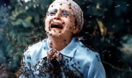 THE BEES (1978) The myth of the African killer bee created a cottage industry for filmmakers in the mid-to-late ’70s, with many independent directors ready to cash in on Irwin Allen’s The Swarm. What these filmmakers didn’t take into account was the moviegoing public’s disinterest in the subject matter. But you have to admire people like Alfredo Zacharias who, despite their limitations, make movies as fascinatingly bad as The Bees. A South American apiary operated by a smug scientist (Claudio Brook)—who patronizes the locals by speaking to them in slow, broken English—is destroyed by angry villagers after a child is killed by the “devil bees.” These hybrid bees are the result of a failed experiment to create a bee which can produce more honey, turning the insects aggressive and deadly. The bees make their way to the States, causing chaos in the streets, with a lot of scenes of people waving their arms around wildly in some of the worst “I’m-being-stung-by-bees!” acting you’ve ever seen. Bee experts John Saxon, Angel Thompkins, and John Carradine eventually figure out a plan to stop the killer bees by turning them gay. No, I’m not kidding. Ultimately, they fail and the bees take over the world, even learning to communicate with man. A really idiotic attempt at trying to make honey bees look scary, this is further harmed by too much use of stock footage (one clip clearly originated in the early ’60s) and some truly abysmal music. Saxon gets thrown through a window, while Carradine chews up the scenery—as well as his old Dracula accent. Probably the only killer bee movie to feature a Jimmy Carter lookalike! A real groaner; for hardcore Saxon completists and military stock footage enthusiasts only. What did I expect from the director of Demonoid? D–