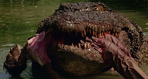 CROCODILE (1979) In the post-Jaws nature-gone-amok sub-school of movies, Crocodile ranks at the very bottom of the barrel. Two overworked colleagues take their families on vacation to a resort on the Gulf of Thailand, only to have several family members eaten by a giant crocodile. The beast, which is the result of genetic mutation from nearby atomic bomb testing, continues to gobble up the locals (and wildlife) until the doctors hire a salty fisherman to destroy the animal. Tone-deaf and dull, Crocodile is made by people who thought audiences would be enthralled by never-ending close-ups of crocodile eyelids, atrocious editing, terrible acting, and a lot of scenes of people thrashing around in red-tinted water. The croc inexplicably changes size to appease the screenplay—the reptile is small enough to hide in shallow waters, but is big enough to take down entire villages with a swipe of its tail. There are a couple of gory moments of victims with chewed off limbs and a scene where the croc swallows a trio of skinny-dipping children (a bit that would never get passed by American censors). That’s not enough to compensate sitting through this incomprehensible dreck, which is actually a re-edited 1978 Korean production entitled Crocodile Fangs. Not to be confused with the Italian-made Killer Crocodile, which, compared to this, looks like Jaws. F