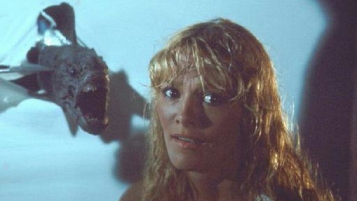 PIRANHA II: THE SPAWNING (1982) This might be James Cameron’s directorial debut, but Piranha II is an Italian production through and through. The guests at a chic Caribbean resort are high on the menu for a school of mutated piranha, which have taken up residence inside a sunken naval ship just off shore. Diving instructor and marine biologist Anne (Tricia O’Neil) thinks there’s something fishy going on when one of her students turns up with his face chewed off, but her arrogant ex-husband, Steve (Lance Henriksen), who just happens to be the town’s chief of police, is more concerned with Anne’s relationship with a flirtatious tourist (Steve Marachuk). More chewed-up bodies start appearing, but on land—that’s because the piranha have spawned wings and have turned into flying killers (inspiring the title of the European release, Piranha II: Flying Killers). Even more of a Jaws wannabe than the first Piranha, The Spawning lifts entire subplots from the Spielberg film, including the nay-saying hotel owner who refuses to close the beach for financial reasons. The script (co-written by Eurotrash producer, Ovidio G. Assonitis) is littered with cardboard characters and hackneyed situations; several tourists are eaten to death while attending a grunion beach party (oh, boy!). Lucio Fulci regular Giannetto De Rossi supplied the make-up FX and they’re mostly effective and bloody, but it’s not enough to distract from the overall lack of energy, so frequent in Joe Dante’s original. Ho-hum. C–