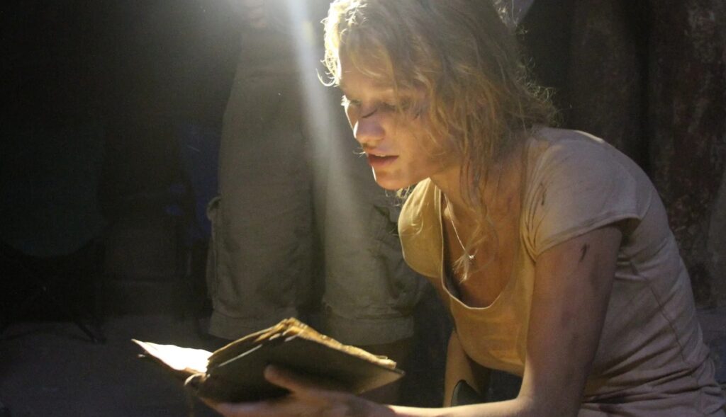 THE PYRAMID (2014) American archeologists stumble upon a buried, unexplored pyramid in the middle of the Egyptian desert. A father-daughter team of explorers are desperate to uncover an entrance into the underground monument, despite the fact the land is being engulfed in Arab Spring-like protests. They’re repeatedly told by their colleagues of impending danger—a warning confirmed when a poor Arabian porter is met with a blast of toxic gas released from the dig site and his face becomes hideously scarred—but the show must go on. Archeologist Dad (Denis O’Hare) and Daughter (Ashley Hinshaw) get their nervous team to journey to the center of the pyramid, where they’re immediately embroiled in bad air, falling debris, and eventually become a food source for some sort of ancient Bastet creature. All of this is flatly presented with no suspense or surprises, giving the viewer very little reason to care about what happens. The execution of the story can only be described as lazy as the filmmakers present a POV/found-footage setup at the beginning of the film but drop it whenever it’s convenient to the writing. The end credits are the only positive thing The Pyramid can offer its audience. F