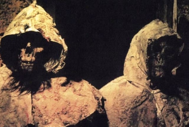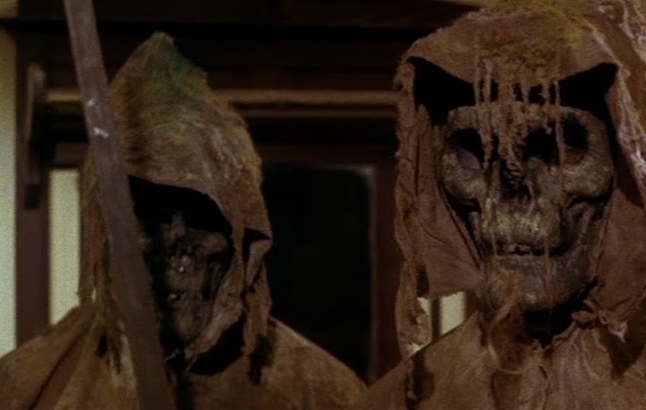 TOMBS OF THE BLIND DEAD (1972) Satanic knights from the Dark Ages rise from their dusty graves to feast on the blood of scantily clad women and ride on horseback in slow motion. The knights awaken without the use of sight (their eyes were devoured by crows pre-burial), but despite being nothing more than walking skeletons in robes, they can sense their prey through sound. A backpacker makes camp near the knight’s gravesite and is descended upon by the zombified pack in a suspenseful sequence. The screenplay is smart enough to understand the living characters are not nearly as interesting as the dead ones, and quickly revives recent victims of the blind dead as bloodthirsty ghouls. The film offers exposition of the knight’s historical dealings in witchcraft and human sacrifices in the form of a decrepit librarian whose scumbag son (JosĂ© Thelman) is given some much deserved, limb-tearing justice by the zombies after he rapes a lesbian. In the annals of zombiedom, Tombs of the Blind Dead won’t be remembered as much of its Night of the Living Dead counterparts, but as an atmospheric chiller it comes recommended. B (Currently available on Plex, Shudder, AMC+, and YouTube.)