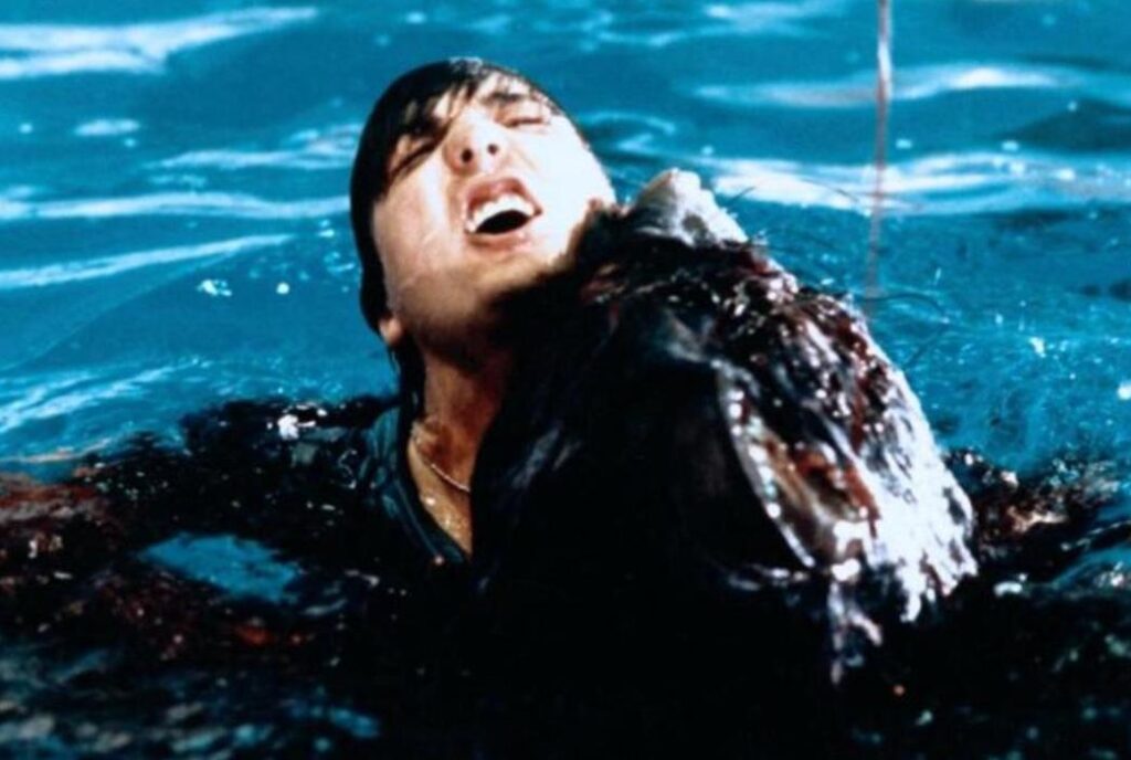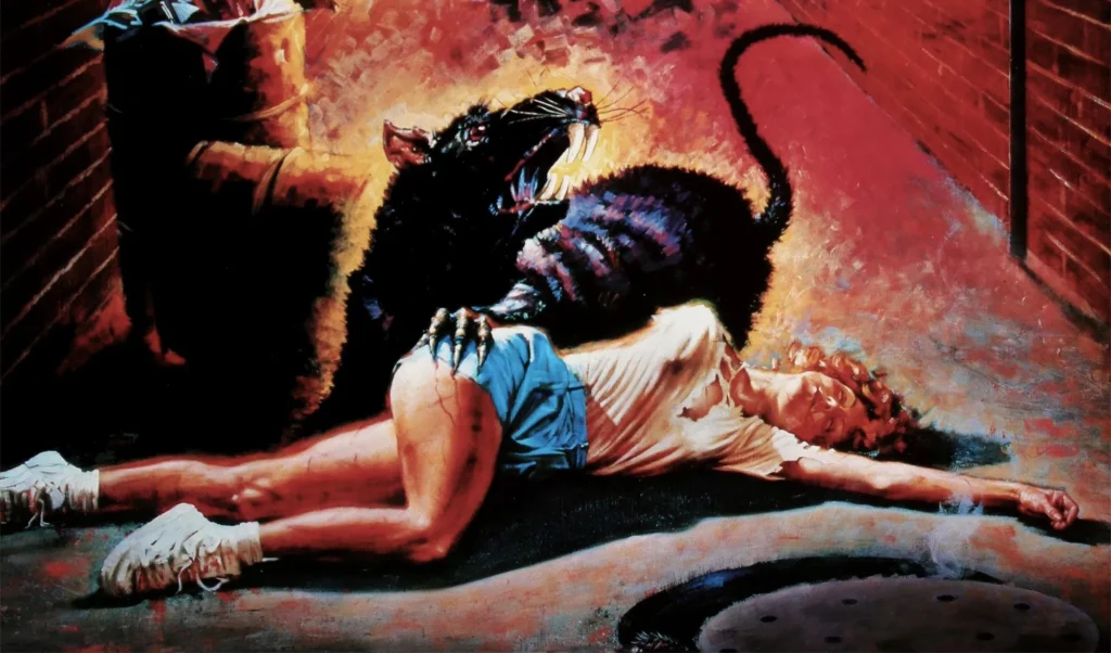 FOOD OF THE GODS PART 2 (1989) (AKA: Gnaw: Food of the Gods 2) An experimental growth hormone grows out of whack and turns its test subjects (the common rat) into oversized beasts. The mutated rodents escape from a university lab and terrorize the campus by turning the population into rat chow. Scientist Paul Coufos’s warnings of danger are ignored by the campus dean, who’s more concerned with the grand opening of the school’s Olympic-sized swimming pool than by the student body being devoured by giant vermin. This subplot leads into the movie’s most memorable scene, where a group of synchronized swimmers are attacked Jaws-style. The film’s gore level is fairly high as body parts are severed and faces are graphically chewed off—one guy gets bitten on the ass while taking a leak in some bushes. The filmmakers try to offset the splatter by having the annoying girlfriend of Coufos continually lecturing him on the immorality of animal testing. Coufos eventually uses “The Pied Piper of Hamelin” to lure the rats to their demise in a sequence that reaches new heights in stupidity. Real rats are placed in miniature sets and are mostly convincing but the effects aren’t really any better than the same method used in the first Food of the Gods (1976), which has nothing to do with this dubious, in-name only sequel. D