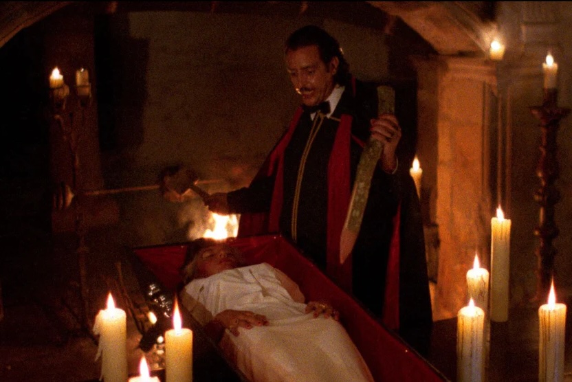 THE LAST HORROR FILM (1982) Vinny Durand (Joe Spinell), a delusional, movie-obsessed cab driver, travels to the Cannes Film Festival, where anyone who gets in the way of his dream of making a horror movie with actress Jana Bates (Caroline Munro) meets an untimely death. A pompous director gets his head cut off after denying Vinny access to Jana. A producer is trapped in a screening room and hacked to pieces with a hatchet. Vinny finally gets a hold of Jana, but she manages to escape and runs into the streets where hordes of pedestrians cheer on what they believe is a publicity stunt—which causes Vinny to stop and bow to his “audience.” The Last Horror Film is a slasher movie but it’s also a self-reflective parody that satirizes not only the horror genre but Hollywood and fame, and does it fairly well. While abundant, the splatter isn’t quite up to par with Maniac (1980)—Last Horror Film was apparently promoted in parts of Europe as Maniac 2!—but there is a gruesome disemboweling, courtesy of a chainsaw; an appropriate gore-filled ending to this fun, if not entirely convincing, spectacle. B–