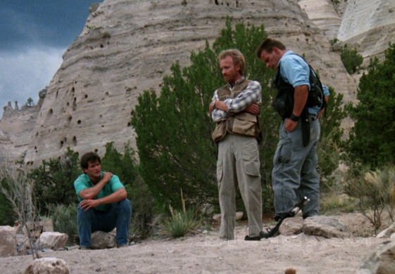 HIGH DESERT KILL (1989) Three friends (Marc Singer, Micah Grant, Anthony Geary) get sucked into an alien mind control experiment while on a hunting excursion in the New Mexico desert. A lack of wildlife is the first sign of danger our callous protagonists ignore. The men meet an old timer (Chuck Conners) whose horses mysteriously disappear into thin air. Two female campers become sexed up nymphs and turn the men’s camp site into an orgy of drinking and fornicating—viewers expecting some titillation in the form of T&A will be disappointed because High Desert Kill was made for network television. Upon returning from hunting Singer stumbles upon his friends eating the raw remains of a bear. The alien takes the form of Grant’s deceased uncle and watches from a distance as the characters become increasingly paranoid and go for each other’s throats—until Scientist Geary realizes they’re “rats in a cage.” When rifles don’t work the men use mind warfare against the alien in the foolish climax. Up to that point the movie is engaging, well acted, and nicely paced. B–