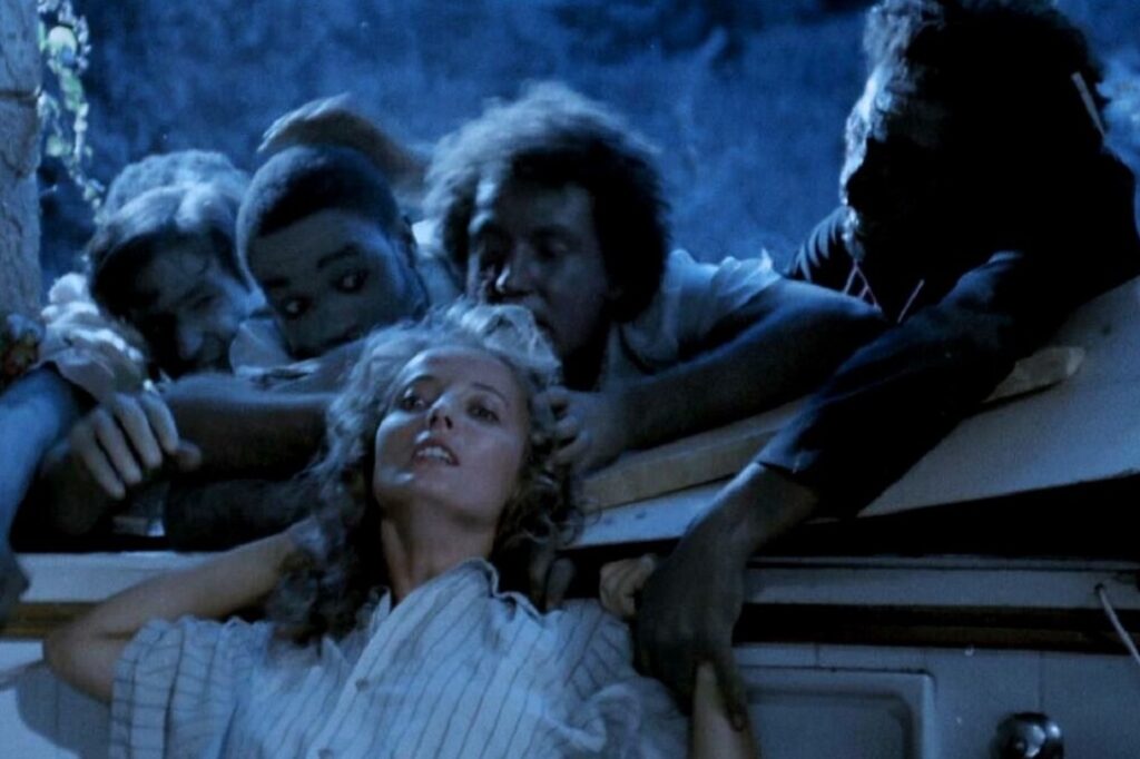 HELL OF THE LIVING DEAD (1980) (AKA: Night of the Zombies; Virus; Zombie Creeping Flesh; Zombie Inferno) A chemical weapons factory in Papua, New Guinea accidentally releases a toxic gas known as “Operation Sweet Death,” promptly turning the building’s scientists into flesh-eating zombies. A SWAT-like commando team gets lost in the nearby jungle where they bump into a television reporter and some tourists—tourists?!—fleeing from the growing zombie invasion. The commandos quickly learn the importance of a shot to the head when they come across a zombified child gorging on his father’s innards. In a truly imbecilic scene, the TV reporter (Margit Evelyn Newton) sheds her clothes and paints her face in order to secure safe passage through native territory. This is bookended by stock footage from an Italian/Japanese “shockumentary” dubbed The Real Cannibal Holocaust. Seeking refuge from the walking dead, our protagonists hide inside a Colonial house, but despite everything they’ve been through, the characters are too dumb to secure the place from the zombies and are overcome, including Newton who gets her eyes gouged out in one of the film’s most notorious moments—a fittingly gruesome ending to this ridiculously contrived but unabashedly entertaining Dawn of the Dead/Zombie ripoff. B–