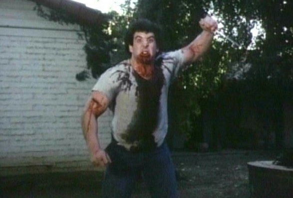 HOME SWEET HOME (1981) A chuckling lunatic (Jake Steinfeld) high on PCP escapes from the hospital, steals a station wagon—running over an old lady in the process—and drives out to the sticks, where he terrorizes a family celebrating Thanksgiving. Steinfeld goes about performing the usual escaped killer tricks (e.g. cutting the phone lines) before he starts eliminating his victims—one of the men, a guitar-playing magician/mime, is perhaps the most annoying character in the history of low budget horror movies. There’s nothing special or original about Home Sweet Home, but despite its contrivances the film has personality and a sense of humor. Gorehounds won’t appreciate the lack of blood, but that doesn’t stop the movie from being an enjoyable, albeit obscure, holiday slasher. Steinfeld would eventually gain fame for his Body by Jake/FitTV empire, as well as becoming an ambassador for physical fitness under Schwarzenegger’s governorship. B–