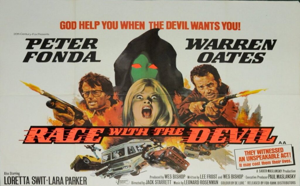 One of the better post-Exorcist Satanic chillers of the mid-70s is definitely 1975’s RACE WITH THE DEVIL. Sort of a hybrid car chase thriller and occult horror, the film focuses on friends and business partners, Frank (Warren Oates) and Roger (Peter Fonda), who own a successful motorcycle dealership in Texas. Going on a skiing vacation with their wives, Alice (Loretta Swit) and Kelly (Lara Parker – Angelique on Dark Shadows), Frank and Roger decide to drive an RV up to Aspen, Colorado, and on the way stop in the country for some motorbike racing fun.