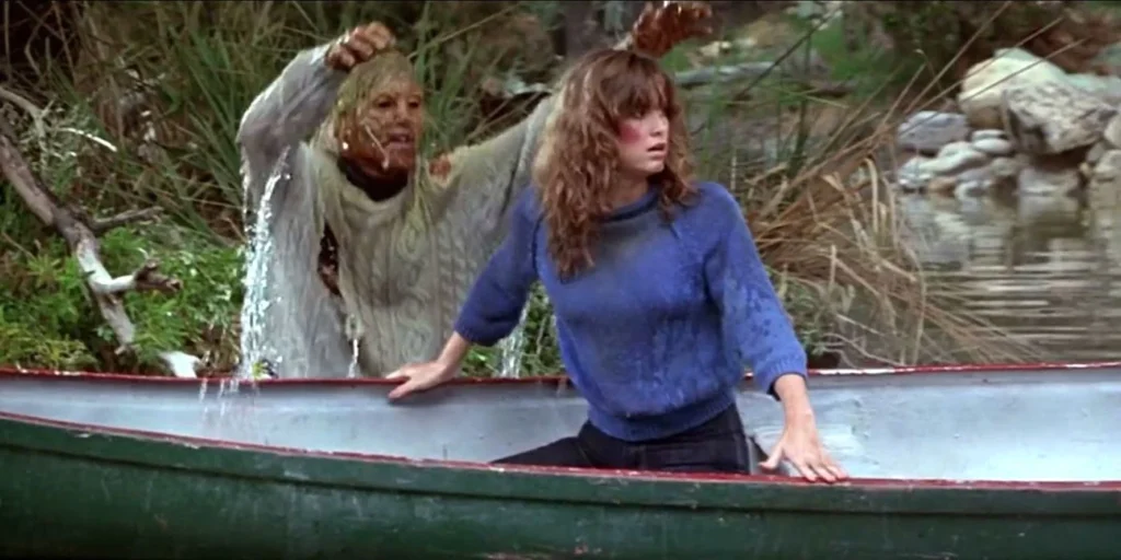 Yet again, we end the movie with a WTF vision/dream. This time, it’s a rotten, worm-covered Mrs. Voorhees (head reattached, wearing her favorite sweater) popping out of the lake to drag Chris from her canoe. But it’s okay, don’t worry. The very last scene reveals that Chris has gone hopelessly insane.