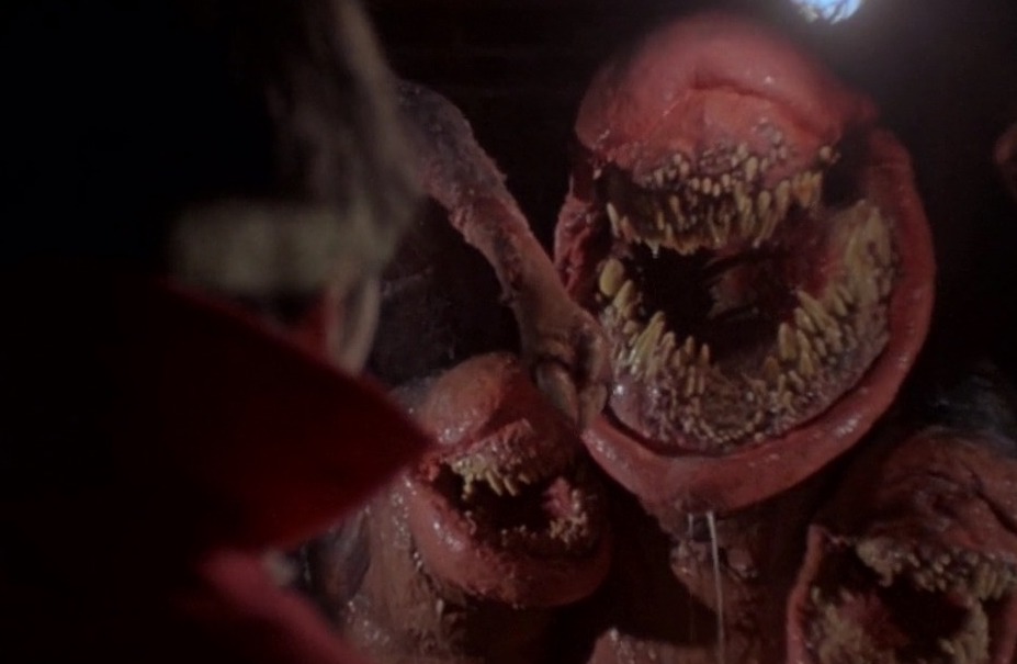 THE DEADLY SPAWN (1983) An enjoyable, low, low budget romp in the tradition of The Evil Dead, this pits a houseful of people against a multi-headed alien beastie with sharp teeth and a large appetite for human flesh. When the house’s monster-loving kid (Charles George Hilderbandt) becomes wise to the creature’s heightened sense of hearing, he uses it to his advantage to try and save his family from becoming next on the alien’s dinner plate. A fast pace and genuine excitement help lift this above its obvious budgetary restraints and somewhat dull characters. The OTT gore FX also add some spice to the paper-thin story, all leading up to a wonderful twist ending that would give Little Shop of Horrors a run for its money. B